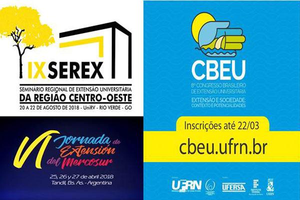 O primeiro evento desse ano será realizado na Argentina, a VI Jornadas de Extensão do Mercosul – JEM, e ocorrerá concomitantemente com o I Colóquio Regional do Centenário da Reforma e o Pré-Congresso Nacional de Extensão Universitária da Argentina, na sede da Universidade Nacional do Centro da Província de Buenos Aires - UNCPBA, em Tandil, na Argentina, entre os dias 24 e 27 de abril de 2018. A submissão de trabalhos está aberta até o dia 20 de fevereiro de 2018.