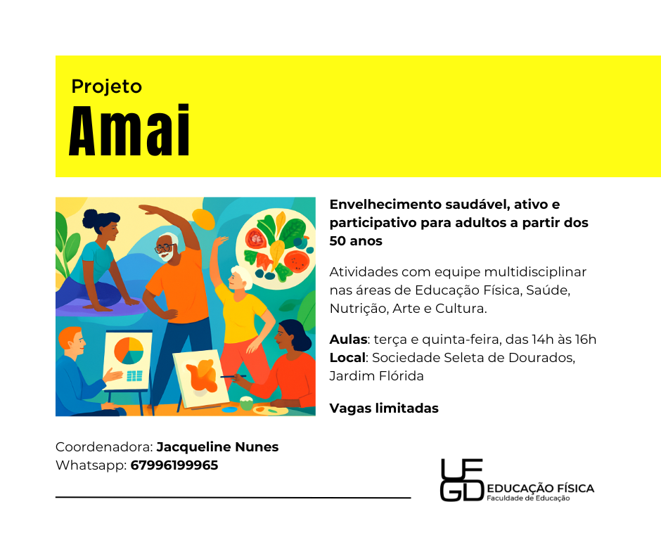 Um dos projetos é o AMAI – Atendimento Multidisciplinar para o Adulto e Idoso em Busca da Longevidade, que tem como objetivo promover o envelhecimento saudável, ativo e participativo. A iniciativa reúne ações nas áreas de Educação Física, Saúde, Nutrição, Arte e Cultura.
