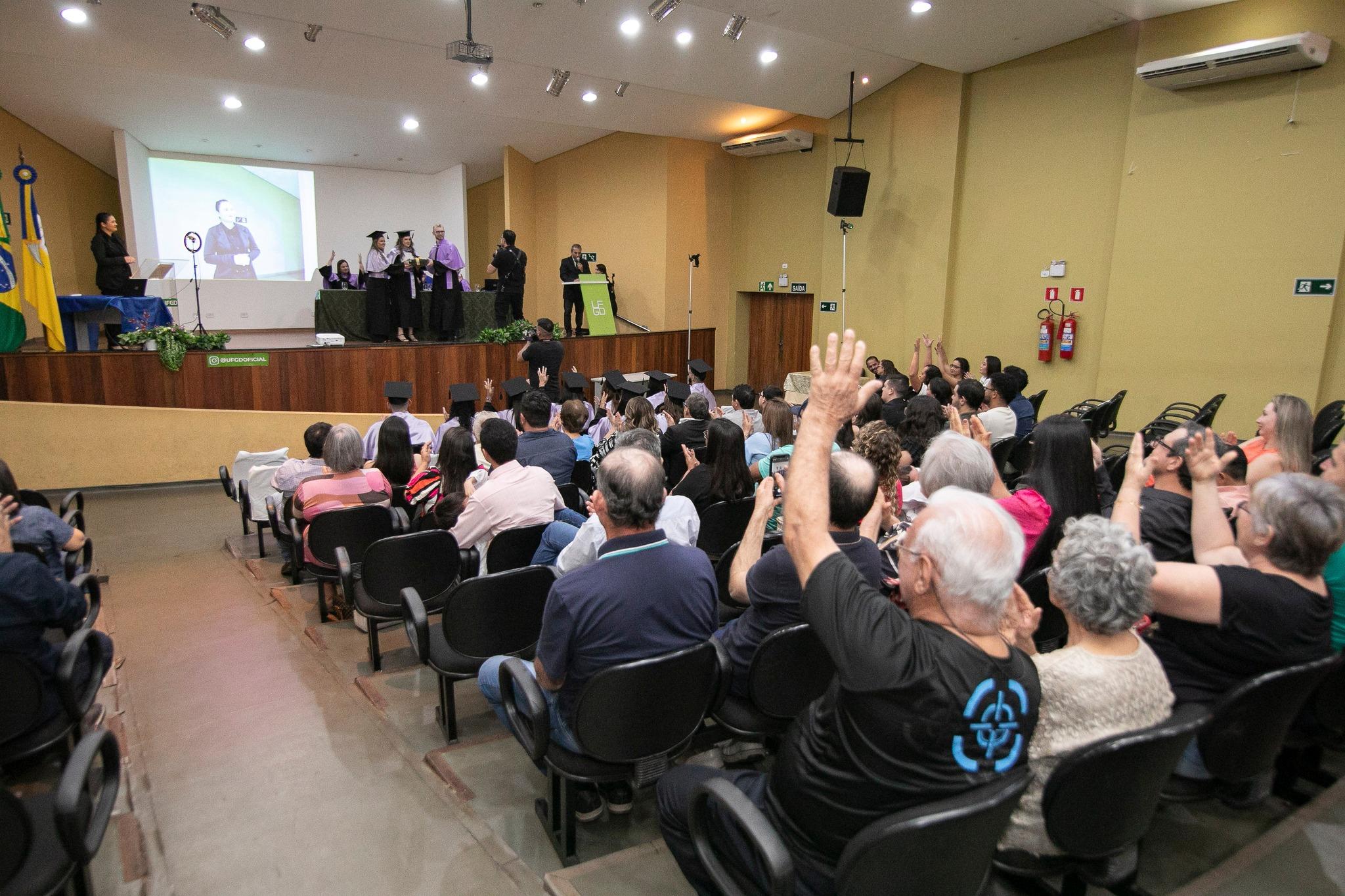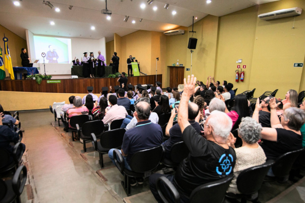 Aplausos dos amigos e familiares durante a colação de grau de estudante do curso de Letras-Libras, no ano de 2024