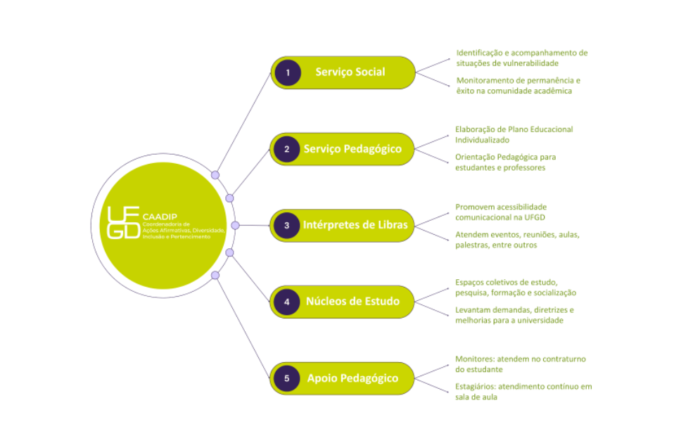 Para além das políticas macro, como a Política de Ações Afirmativas em elaboração, a CAADIP desenvolve frentes específicas de atuação, como o serviço social, o apoio pedagógico, a tradução e interpretação em Libras e o núcleo de estudos, atendendo às demandas de diversos grupos historicamente marginalizados e buscando combater os efeitos da discriminação étnica, racial, religiosa, etária, de gênero, de classe, de origem nacional ou de condição física.