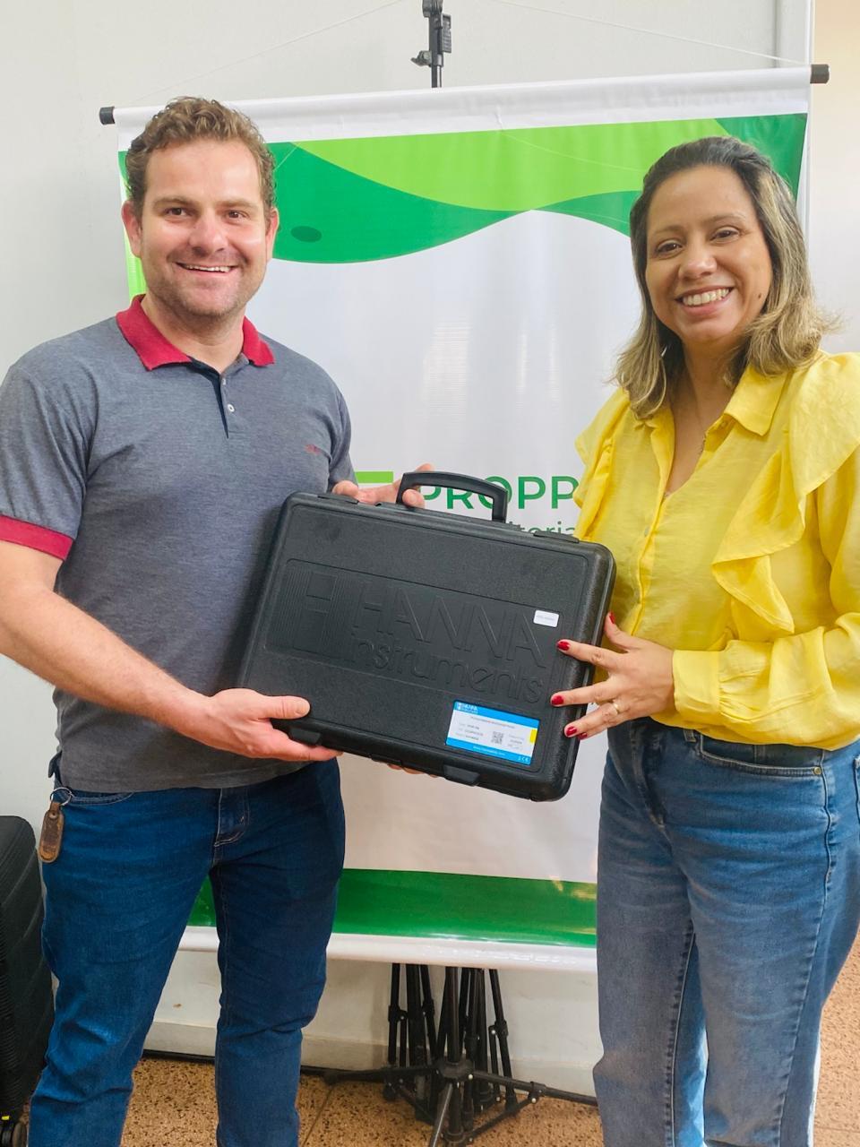 A Pró-Reitora de Pesquisa e Inovação (PROPI) Seila Rojas de Souza fazendo a entrega da sonda para o PPG Engenharia Agrícola.