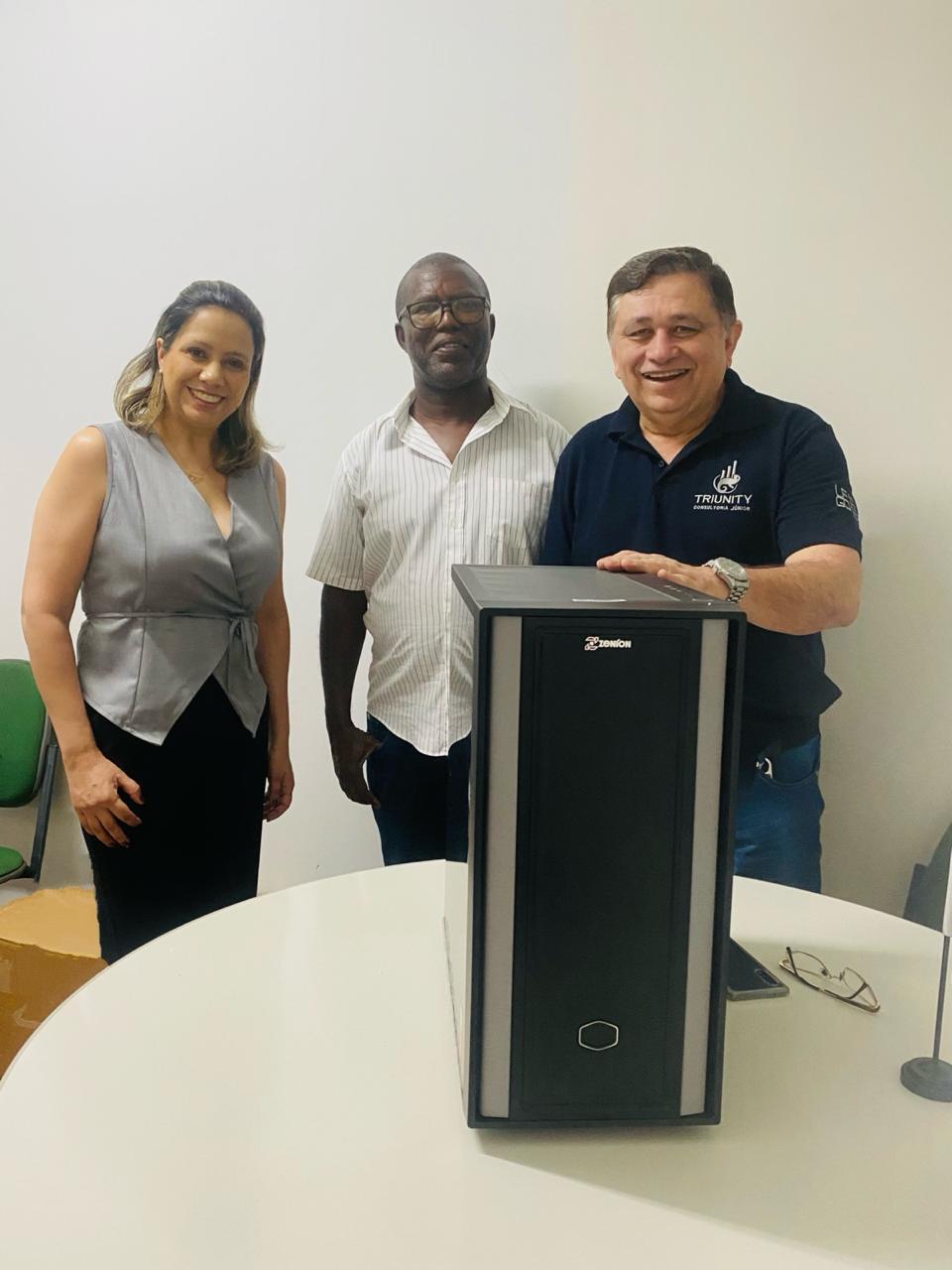 A Pró-Reitora de Pesquisa e Inovação (PROPI) Seila Rojas de Souza fazendo a entrega do workstation destinado ao Programa de Pós-graduação em Agronegócios aos professores Antonio Carlos Vaz Lopes e Enrique Duarte Romero,