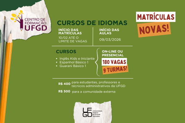 As aulas terão início no dia 9 de março. As matrículas poderão ser realizadas até o preenchimento total das vagas, por meio de formulário eletrônico, que estará disponível na página do Centro de Formação a partir de 10 de fevereiro de 2026, no endereço eletrônico: https://portal.ufgd.edu.br/secao/centro-formacao-proex/index