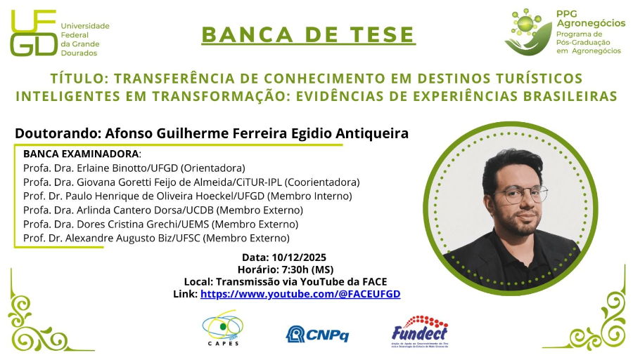 O Programa de Pós-Graduação em Agronegócios da Universidade Federal da Grande Dourados (UFGD) convida a comunidade e demais interessados para acompanhar, em sessão pública, a defesa da tese do doutorando Afonso Guilherme Ferreira Egidio Antiqueira.